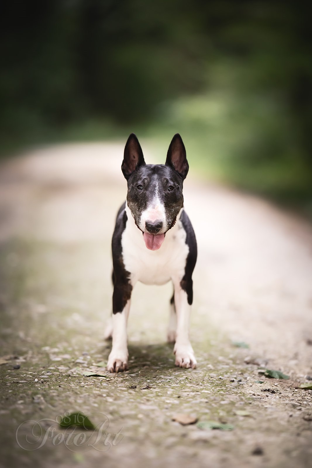 Artgenossen: ist verträglich mit Artgenossen. – bei Spaziergängen in grossen Gruppen, möchte das Bullitier gerne vorne laufen, wenn nicht, ertönen Geräusche in der Mischung Meerschweinchen/Ente/Baby